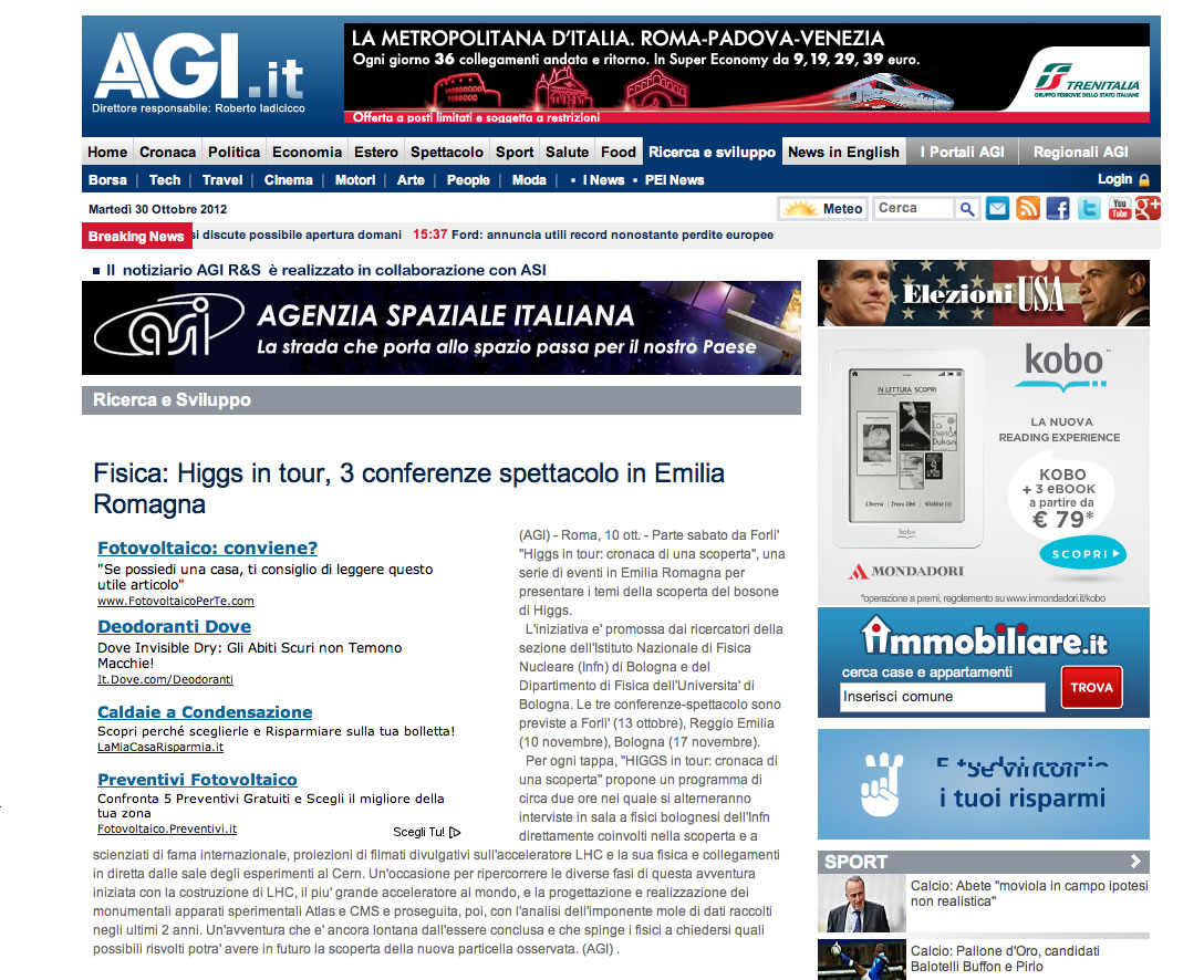 FISICA: HIGGS VA IN TOUR, 3 CONFRENZE SPETTACOLO IN EMILIA ROMAGNA AGI.it 10/10/2012