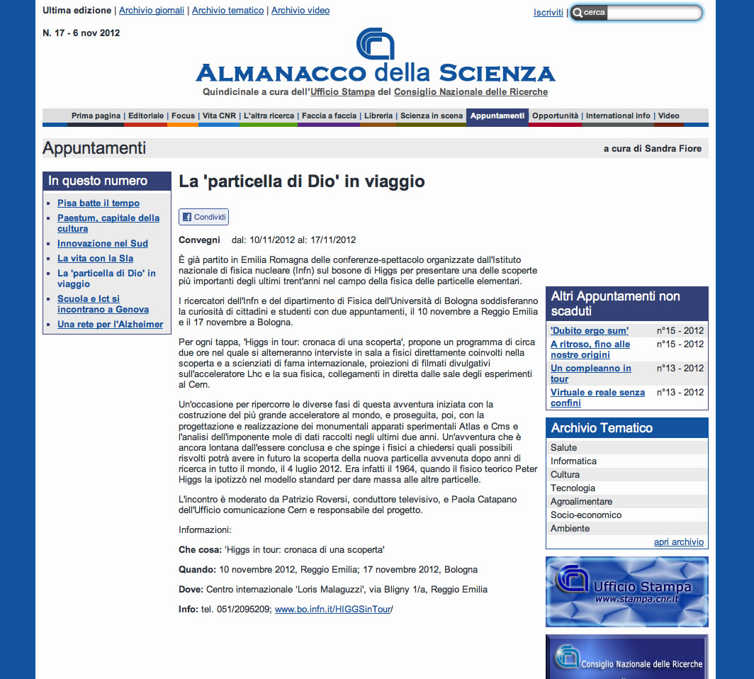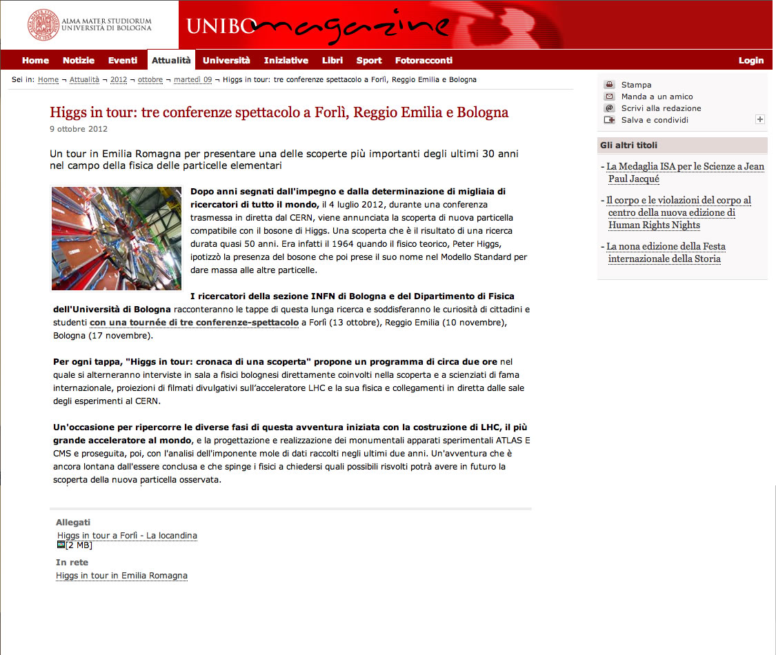 HIGGS IN TOUR: 3 CONFERENZE SPETTACOLO A FORLI', REGGIO EMILIA; BOLOGNA Unibomagazine 09/10/2012