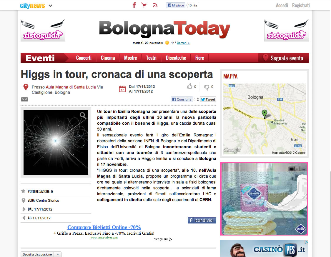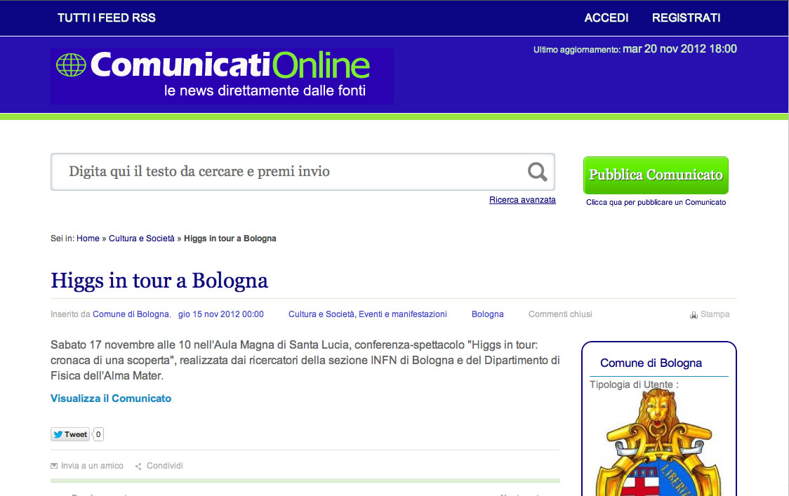 HIGGS IN TOUR, CRONACA DI UNA SCOPERTA BOLOGNAToday 15/11/2012