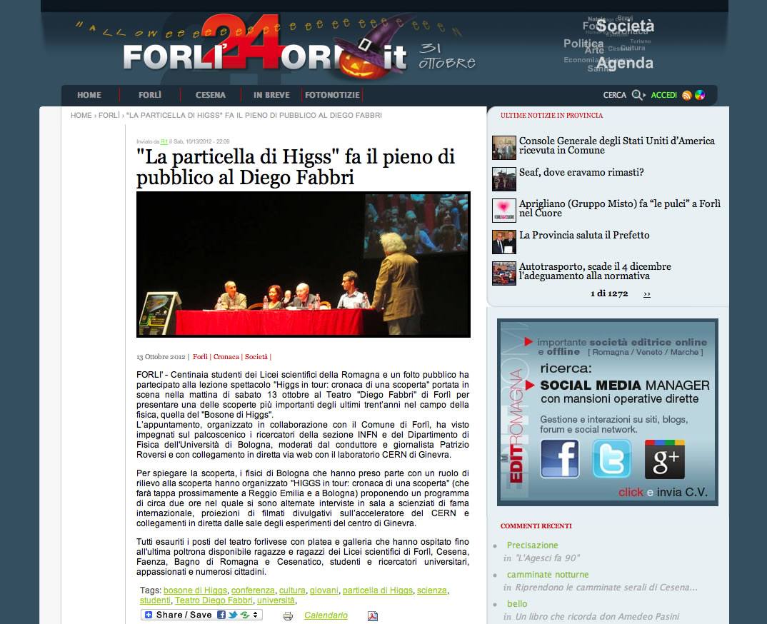 CON LA "PARTICELLA DI DIO" LA SCIENZA DIVENTA SPETTACOLO: CONFERENZA DOMANI MATTINA AL TEATRO FABBRI Romagna Corriere di Forlì e Cesena 12/10/2012