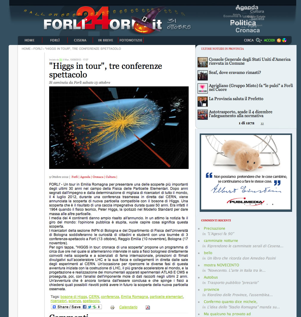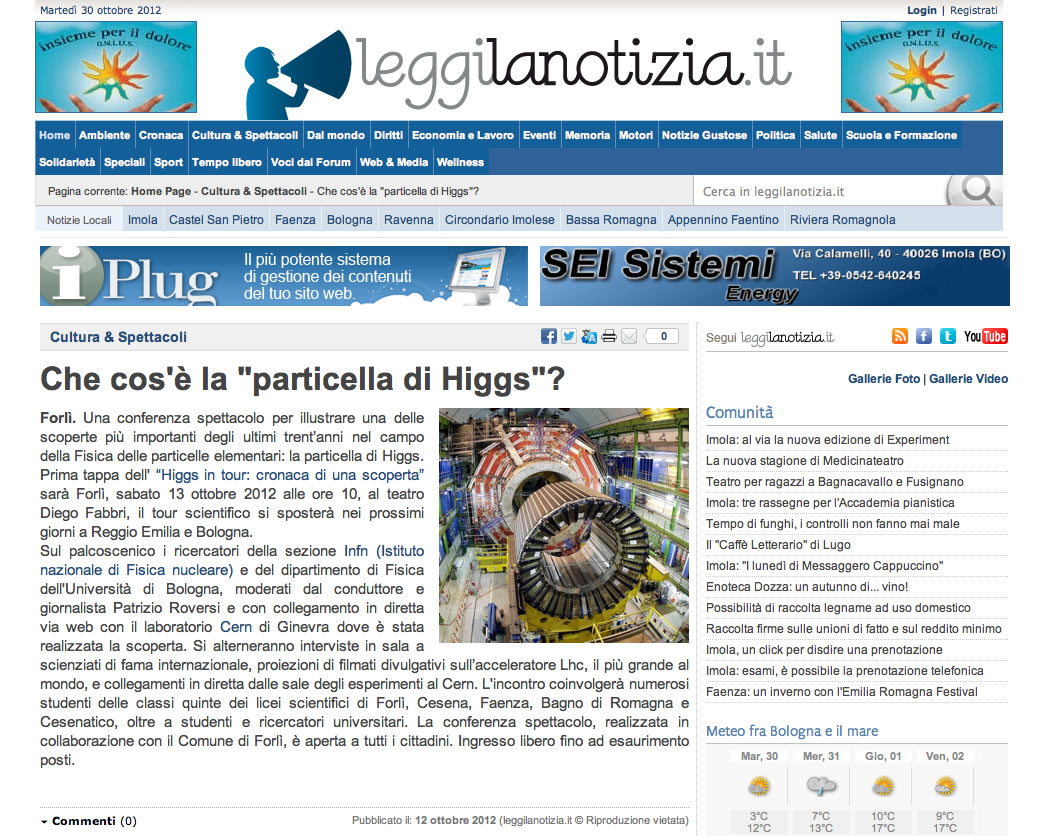 SCIENZA: UN TOUR TRA FORLI', REGGIO E BOLOGNA: I MISTERI DELLA PARTICELLA DI DIO Il Resto del Carlino 10/10/2012