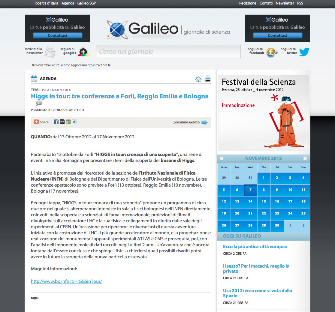 HIGGS IN TOUR: 3 CONFERENZE SPETTACOLO A FORLI', REGGIO EMILIA; BOLOGNA GALILEO giornale di scienza 12/10/2012
