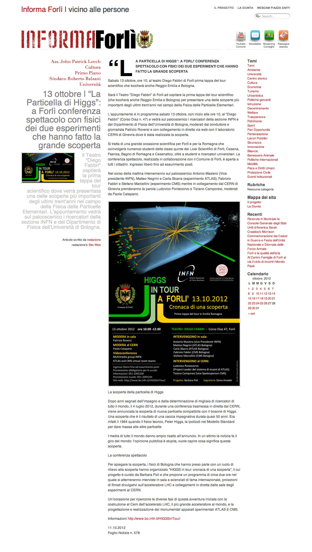 LA PARTICELLA DI HIGGS: A FORLI' CONFERENA SPETTACOLO CON FISICI DEI 2 ESPERIMENTI CHE HANNO FATTO LA GRANDE SCOPERTA InformaForlì 11/10/2012