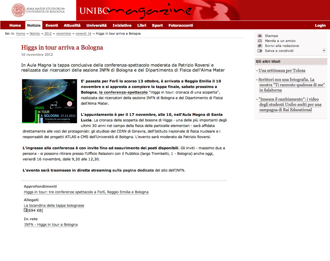 HIGGS IN TOUR ARRIVA A BOLOGNA Unibomagazine 16/11/2012