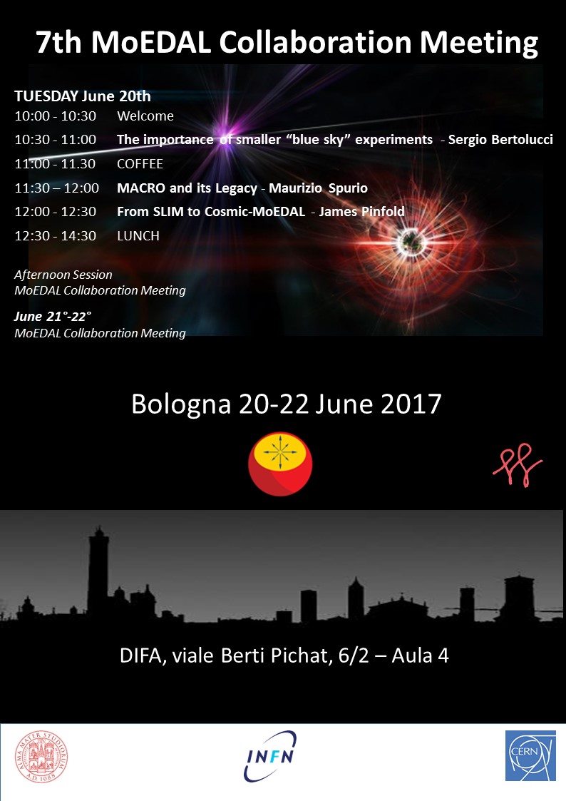 La Sezione INFN di Bologna ospita dal 20 al 22 di Giugno il 7° Meeting di Collaborazione di MoEDAL (Monopole & Exotics Detector at the LHC), esperimento dedicato alla ricerca dei monopoli magnetici e di altre particelle stabili altamente ionizzanti. Il rivelatore, installato in prossimità del VELO di LHCb, è costituito da un sistema di rivelatori nucleari a tracce, un “trapping” detector e TimePix Radiation Monitors. L’incontro inizierà martedi 20, alle 10.30, con una sessione aperta a tutti, dedicata a Giorgio Giacomelli, il cui nome resta legato alla ricerca dei monopoli magnetici. I monopoli magnetici rappresentano la controparte della carica elettrica nelle equazioni di Maxwell. La loro esistenza fu ipotizzata da Paul Dirac nel 1931 per spiegare la quantizzazione della carica elettrica. La ricerca dei monopoli è andata avanti nei decenni con esperimenti agli acceleratori e nella radiazione cosmica.