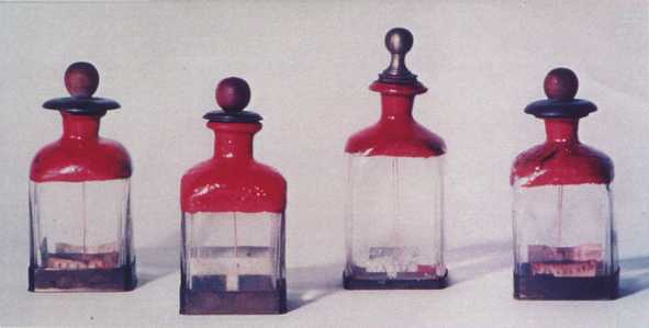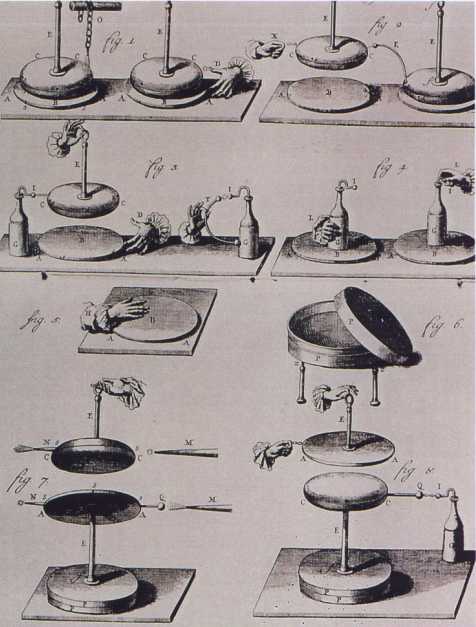 Volta starts his career as a so called electrifying physicist with a paper in Latin where he criticizes the theories of his time. In 1775 he invents the electrophorous, an instrument which utilizes electrostatic induction to produce electricity, without rubbing. In 1782 he describes an instrument capable of detecting very small quantities of electricity, the microelectroscope or condenser of electricity. The apparatus consists of two conducting disks separated by a thin insulating layer. The upper disk is placed in contact with a charged body, while with a finger one touches the lower disk. The contacts are removed, the upper disk is raised and one observes with an electroscope that it is charged. Later Volta modifies the apparatus, connecting it directly to an electroscope. In order to explain how the instrument works, Volta uses the concept of electric capacity and writes a relation between voltage, capacity and quantity of charge, the basic formula of electrostatics. Convinced that nothing good can be done if one does not quantify the measurements, Volta modifies the electroscope and makes measuring instruments, linear and universal, of the electric potential. 1) The condenser. 2) Electrometers. 3) The electrophorous |