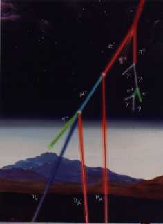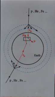 The Standard Model of Particle Physics (the model of the strong and electroweak interactions) contains 3 types of neutrinos, all with zero mass: the electron, muon and tau neutrinos, associated with the electron, muon and tau lepton, respectively. There are strong indications in favour of neutrino oscillations, that is for the possibility that one type of neutrino may transform into a neutrino of a different type. In this case one goes beyond the Standard Model and neutrinos have non zero masses. Cosmic rays may yield muon and electron neutrinos: one speaks of atmospheric neutrinos, which originate in a spherical surface at about 20 km from the earth surface, and move rapidly towards the Earth. 1/2) Scheme of how atmospheric neutrinos originate. |