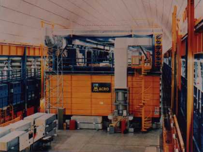 MACRO has measured a number of atmospheric neutrinos smaller and with a different zenith angle distribution than anticipated, which are indications for neutrino oscillations. MACRO is also measuring high energy muons from above, and searches for rare particles in the penetrating cosmic radiation, in particular magnetic monopoles. 3) MACRO, located in the Gran Sasso Lab, has dimensions of 12 m x 10 m x 77 m. |