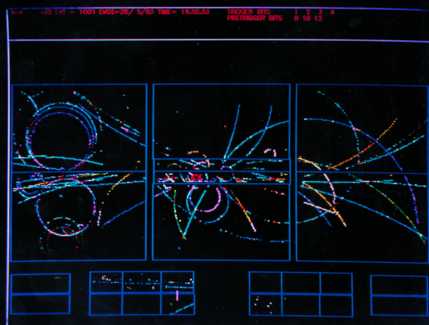 The bottom figure shows the first event observed by the UA1 experiment, in which a Z0 boson is produced. The experiment, performed in 1983 by Carlo Rubbia and collaborators, was done at the proton-antiproton collider at CERN. The upper figure shows the first event e+e- Z0 Z0 charged leptons observed in 1997 at the electron-positron LEP collider at CERN. The positron is the anti-particle of the electron: the first Z0 decays into one electron and one positron (e-, e+) the second into two taus (t- ,t+); also the taus decay before reaching the detector, and only some of the particles produced in the decay are observed, in this case a muon m+ and a pion p-.